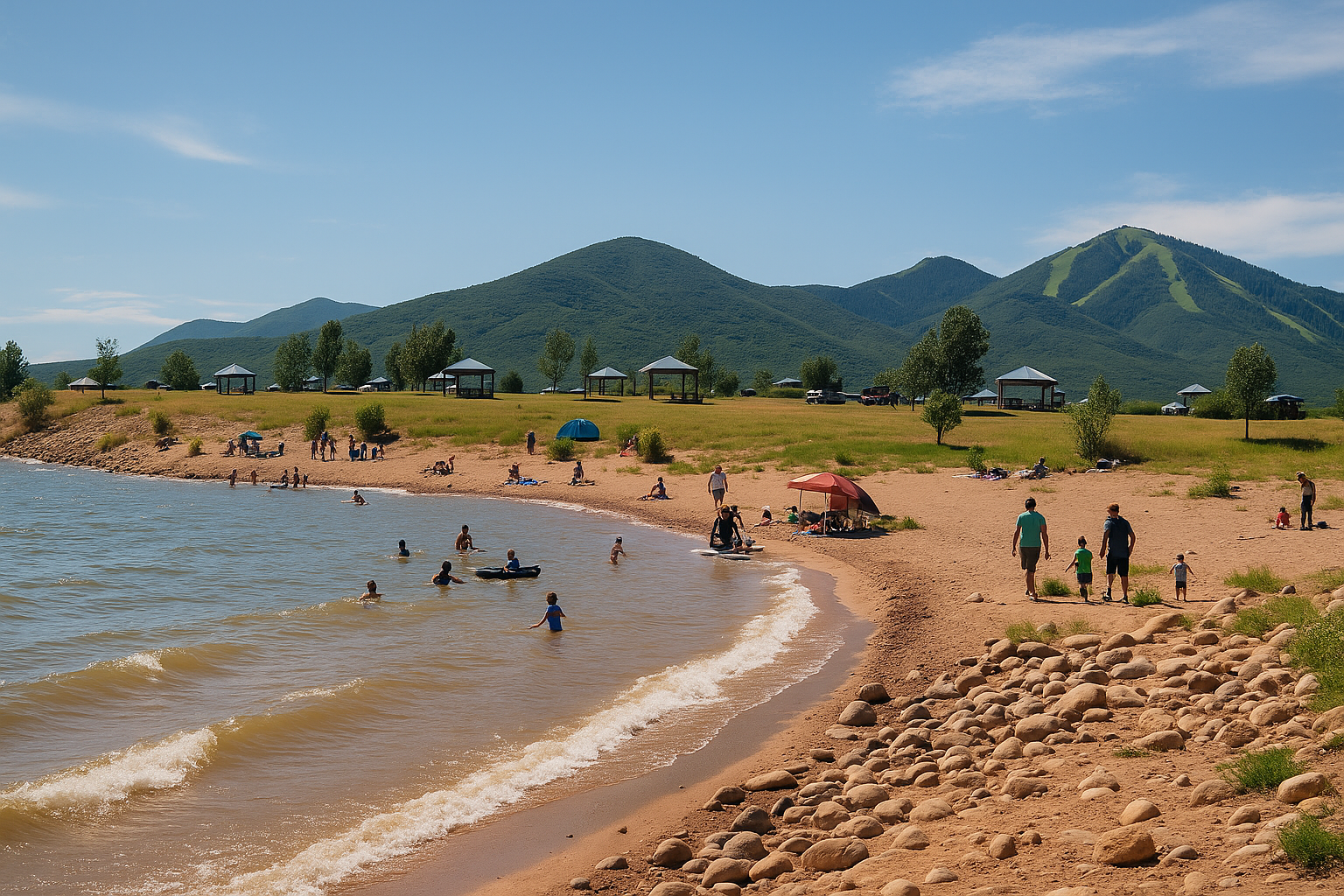 A lakefront beach area with picnic tables and area for swimming and non-motorized watercraft.